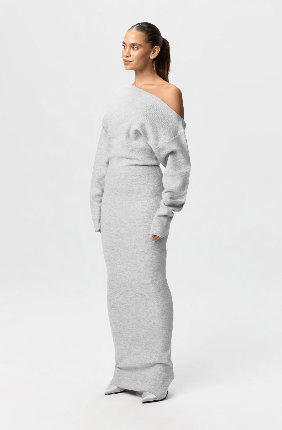 Crafted with a soft, flexible knit, Elsie features a slouchy drop-shoulder neckline that can be worn off one shoulder for a chic, feminine silhouette. The full-length, form-skimming design elongates the figure, while the long sleeves add warmth and sophistication.