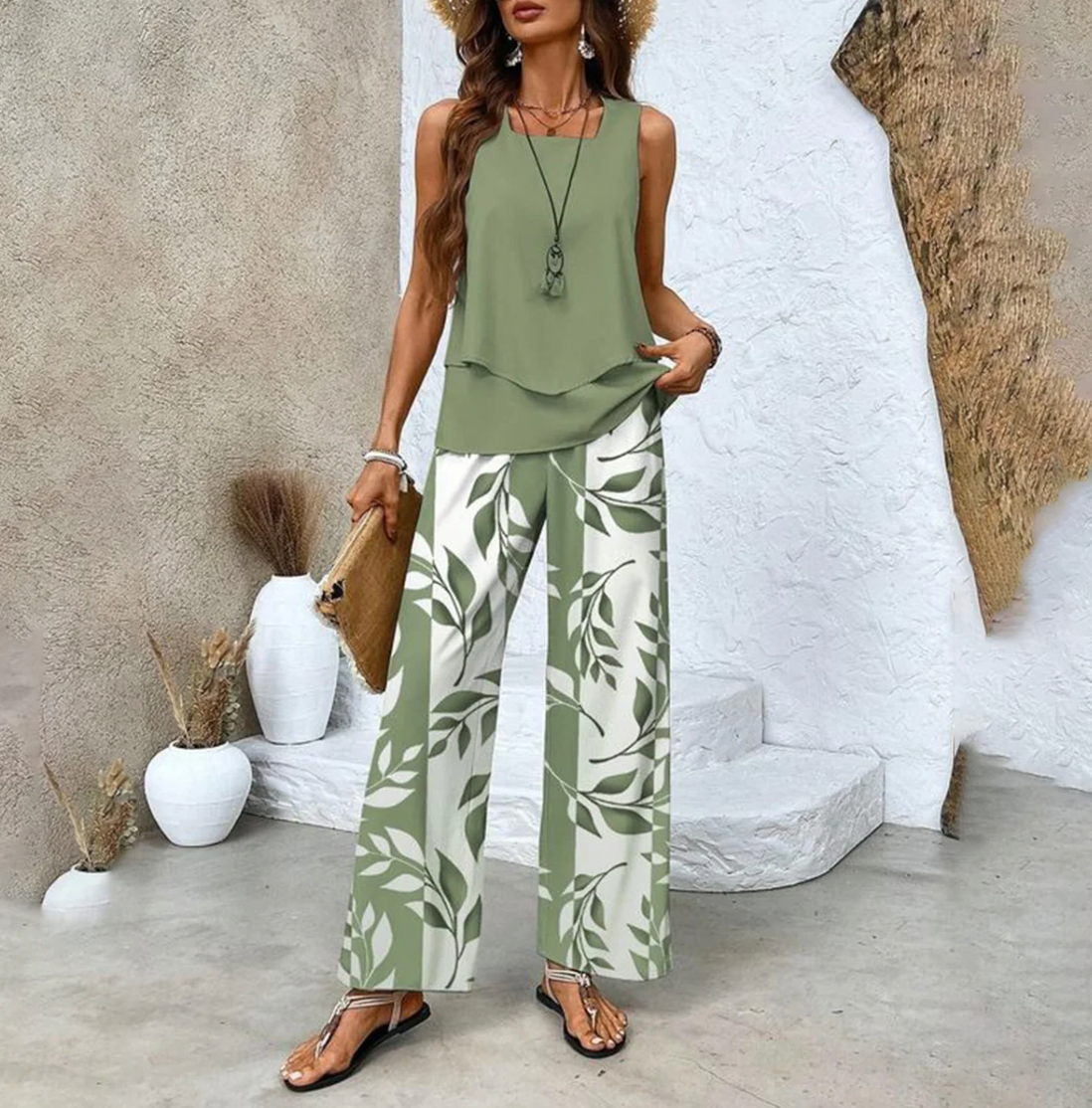 Beatrice combines style and comfort in a refined two-piece set. The airy top and wide trousers with a subtle leaf print create an elegant and effortlessly chic look, perfect for various occasions.